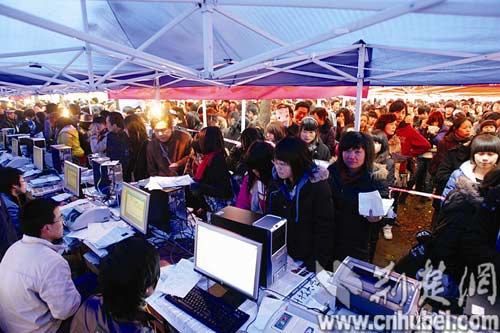 荆楚网消息 (楚天都市报)(记者罗欣 李辉摄) “我早上5点就来了,按通知,8:30就可以报名,可排在第一个的我到现在都还没报上。”昨日上午10:20,武汉科技大学设在省教育考试院沙湖考试基地的艺术校考报名点前,学生家长赵女士气愤地说道。因工作人员迟到、操作频出故障,数百名报考该校的考生在寒风中多等了近两个小时。