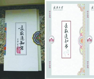 前日,武汉大学官方微博微信公布了该校今年录取通知书的图片。随后,有网友发帖称武大今年的录取通知书和中国人民大学去年的很相似,质疑武大抄袭人大创意。