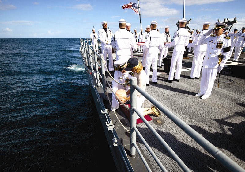 楚天都市报讯 图为:阿姆斯特朗的妻子卡萝尔将骨灰放进大海 新华社发