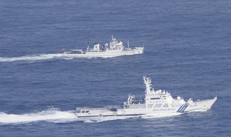 图为:18日,我渔政船与日本海上保安厅巡逻船(下)并行