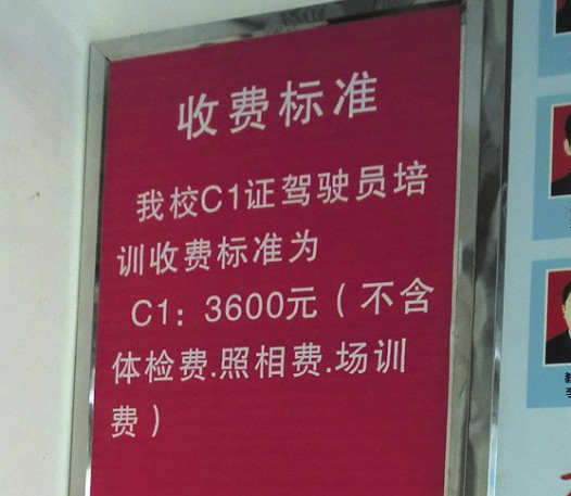 9月1日前,挂在驾校报名处墙壁上的收费标准告示牌