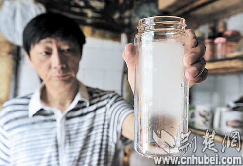 楚天都市报讯 (记者向清顺 实习生王凤 赵金花)昨晨7时许,三阳路太平社区的郑师傅起床用水时,发现家中自来水呈乳白色,犹如“牛奶”。郑师傅不敢使用,他接了一些自来水,沉淀很长时间后,水才慢慢变清(如图)。