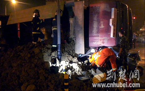 荆楚网消息(记者张扬 通讯员田景超、董家序)8月30日凌晨,武汉一辆满载泥土的渣土车,行驶至硚口区古田二路与解放大道交叉路口处突然发生侧翻,车身连同数吨重泥土一起压在了旁边一辆出租车上,司机和乘客被困变形的车中。