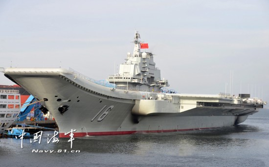多家媒体消息称,2012年9月23日16时许,中国第一艘航母平台16号舰在大连举行升旗仪式,16号舰与相邻停泊的88号舰全部挂满旗。16点40分,16号舰舰桥桅杆升起五星红旗,舰首升起八一军旗,舰尾升起海军军旗。 据某军事网站爆料称,中国第一艘航母当天举行了交付仪式并即将服役,引发网友热烈讨论。而日前,中船集团新闻发言人曾表示,航母已服役传闻不实,交付时间需等待。