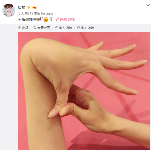 5月11日,唐嫣晒出一张自己在做“手指瑜伽”的照片,照片中,唐嫣的左手大拇指反向碰到手腕,被网友称赞不能更强悍。