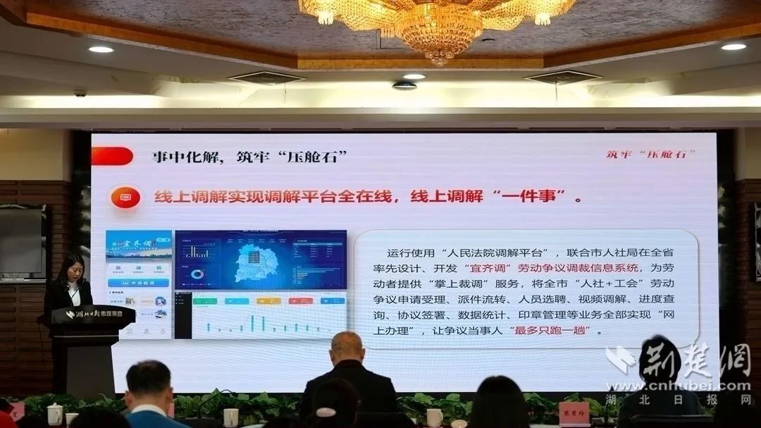 线上调解实现调解平台全在线,线上调解“一件事”。运行使用“人民法院调解平台”,联合市人社局在全省率先设计、开发“宜齐调”劳动争议调裁信息系统,为劳动者提供“掌上裁调”服务,将全市“人社+工会”劳动争议申请受理、派件流转、人员选聘、视频调解、进度查询、协议签署、数据统计、印章管理等业务全部实现“网上办理”,让争议当事人“最多只跑一趟”。2024年全市“工会+法院+人社”线上受理诉调、裁调对接案件896件,办结870件,办结率97.1%,达成调解协议案件715件,调解达成率79.8%,其中多人案件96件,案件调解时长最快实现“当日调”。