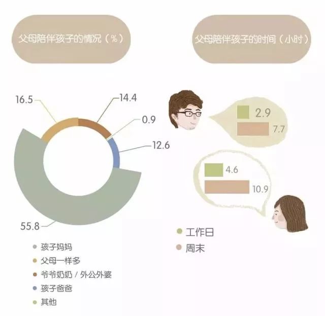 据《2017年中国家庭亲子陪伴白皮书》发布报告显示,超过55%的家庭,是妈妈担当陪伴孩子的的主力。而爸爸陪孩子较多的家庭,比例仅占12.6%,时间更是少得可怜的2.9小时/每天。