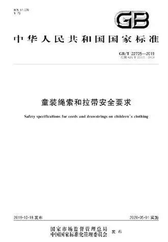 GB/T 22705-2019《童装绳索和拉带安全要求》按照人体4大区域(头部、颈部和上胸部区域;胸腰部区域;臀部以下区域;背部区域),对不同的绳索和拉带(功能性绳索、拉带、装饰性绳索、绳圈、可调节搭袢、肩带、打结腰带或装饰腰带等)提出了要求,结合风险评估,以全面、细致的推进婴幼儿和儿童服装上使用的绳索和拉带安全性。