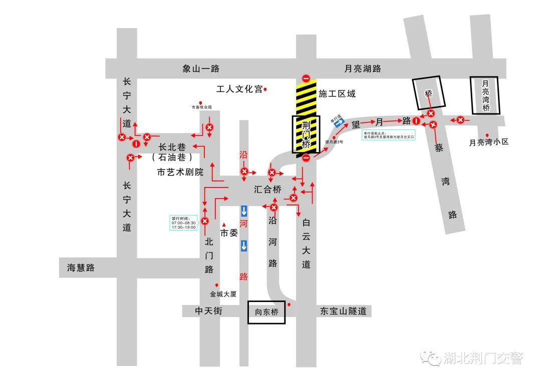 五、北门路车辆7:00-8:30、17:30-19:00高峰时段,由南向北行驶至汇合路时禁止直行;北门路北端车辆由北向南行驶至长北巷时禁止直行。