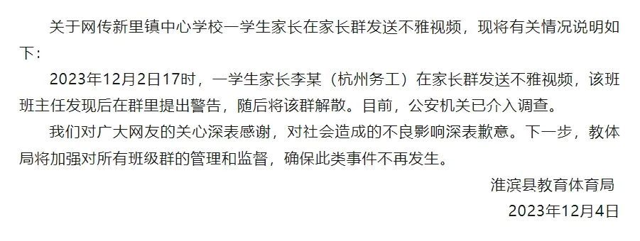 网传河南省信阳市淮滨县新里镇中心学校一学生家长在家长群发送不雅视频,12月4日晚,淮滨县教育体育局据微信公号“淮滨县融媒体中心”发布情况说明: