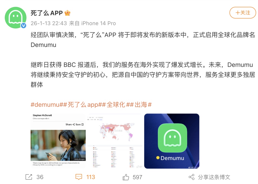 经团队审慎决策,“死了么”APP将在即将发布的新版本中,正式启用全球化品牌名Demumu。