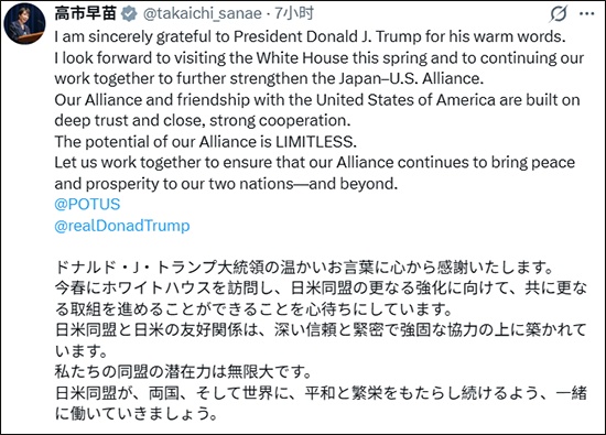 高市早苗深夜在X平台上用日、英双语发文,对美国总统特朗普早前的发声表示感谢。她说,“我衷心感谢总统特朗普的热情致辞,并期待着今年春天访问白宫。我将继续与特朗普总统共同努力,进一步巩固日美同盟。”