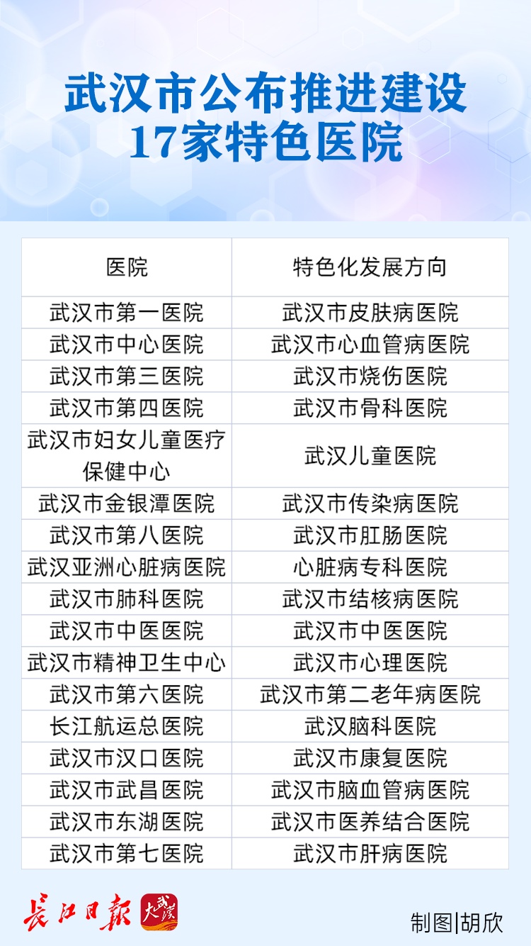 除上述12家综合医院外,武汉儿童医院、武汉市金银潭医院、武汉市肺科医院、武汉市精神卫生中心、武汉亚洲心脏病医院等5家专科医院则要立足原有专业特色,在强基创优上提档升级、做实做强,实现精细化发展,建成具有鲜明特色的高水平专科医院,跻身全国前列。