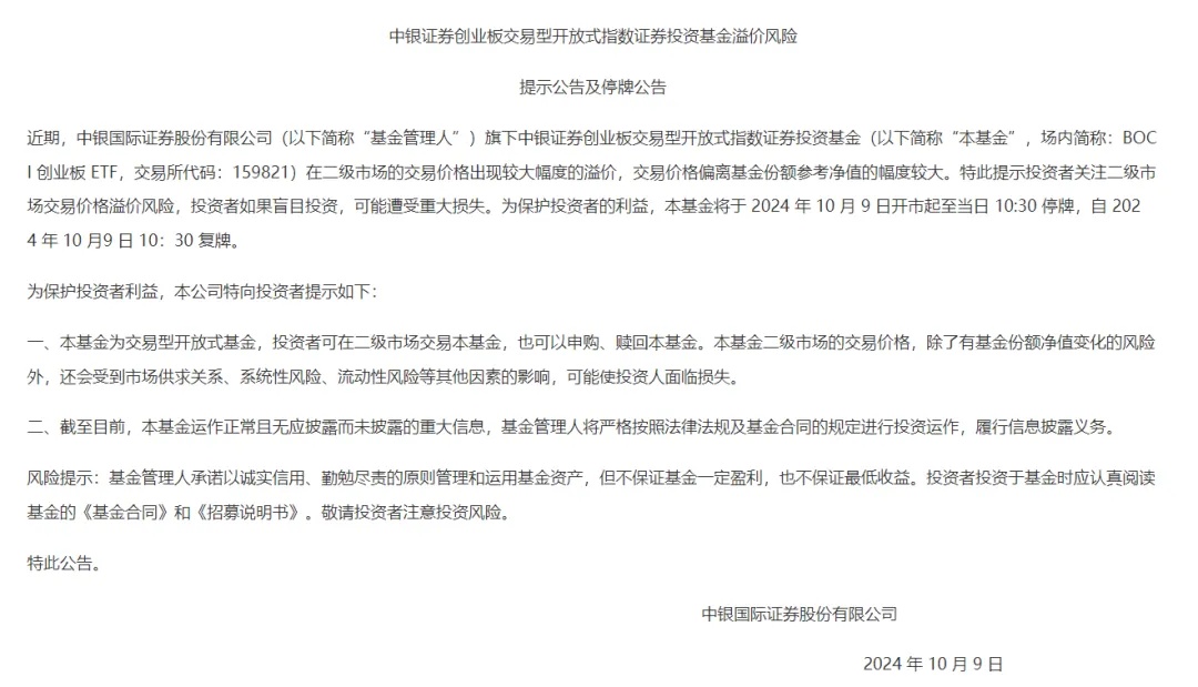 10月8日晚间,中银国际证券公告称,中银证券创业板ETF在二级市场的交易价格出现较大幅度的溢价,交易价格偏离基金份额参考净值的幅度较大。特此提示投资者关注二级市场交易价格溢价风险,投资者如果盲目投资,可能遭受重大损失。为保护投资者的利益,基金将于10月9日开市起至当日10:30停牌,自10月9日10:30复牌。