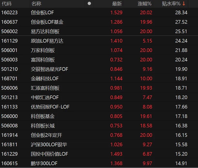 10月8日,国泰创业板20%涨停,溢价率超过28%,鹏华创业板、易方达科创板等溢价率也在25%以上。