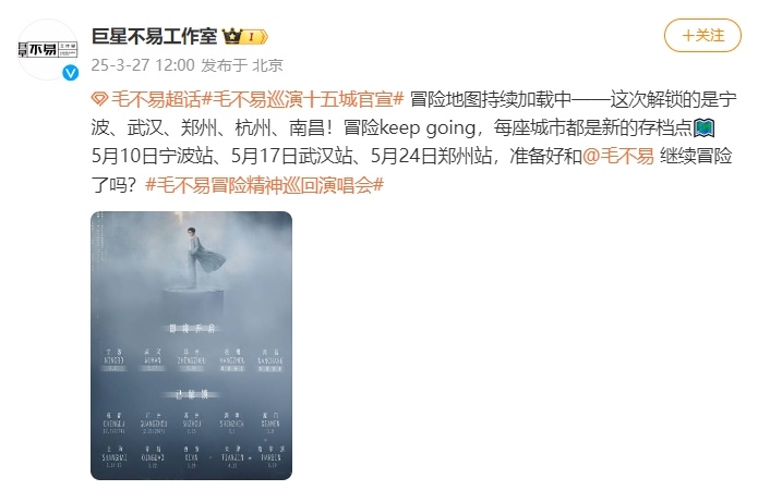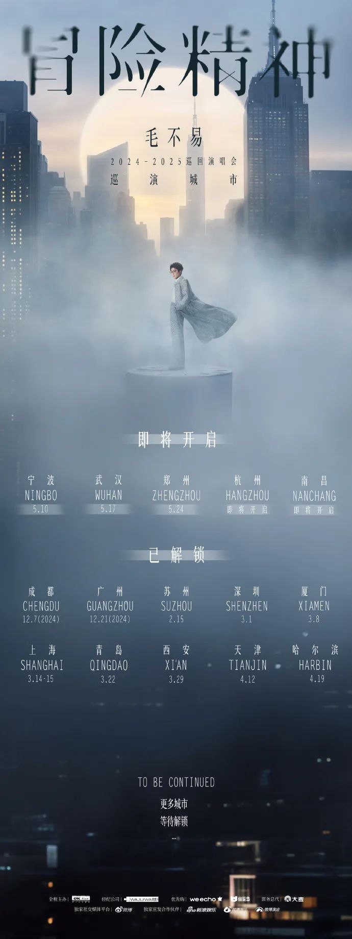 5月10日宁波站、5月17日武汉站、5月24日郑州站,准备好和@毛不易 继续冒险了吗?