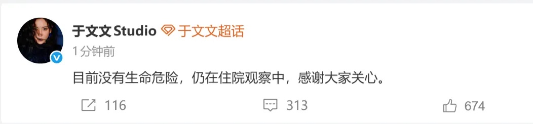 2月1日晚11点40分,于文文工作室发文报平安:目前没有生命危险,仍在住院观察中,感谢大家关心。