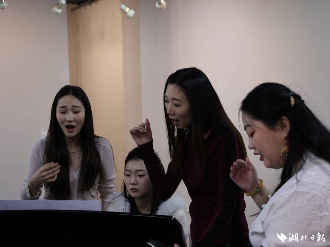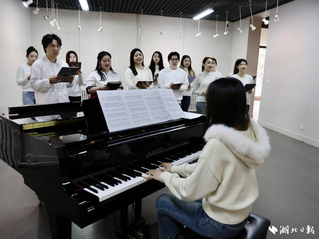 金珂宇(左一)和张姣(左三)正带领学生排练《七子之歌》。(湖北日报全媒记者 刘毅 摄)