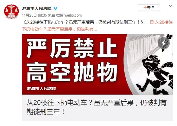 2019年11月14日,最高人民法院印发了《最高人民法院关于依法妥善审理高空抛物、坠物案件的意见》。《意见》明确,故意从高空抛弃物品,尚未造成严重后果,但足以危害公共安全的,以危险方法危害公共安全罪定罪处罚。
