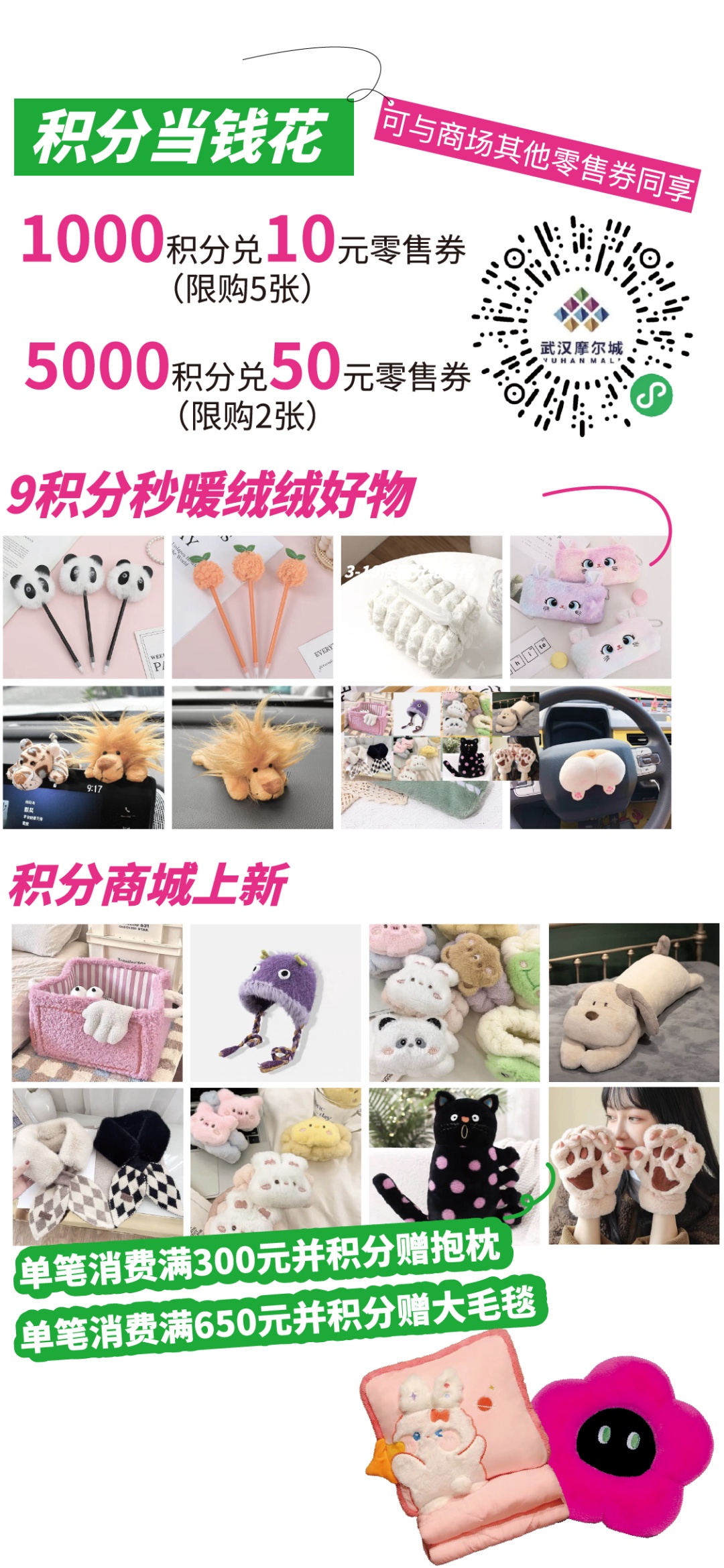 店庆期间,全馆消费3—10倍积分轮番抢, 9积分毛茸茸好物每日10:00开抢,积分商城全线上新,积分边赚边花,错过这次再等1年。