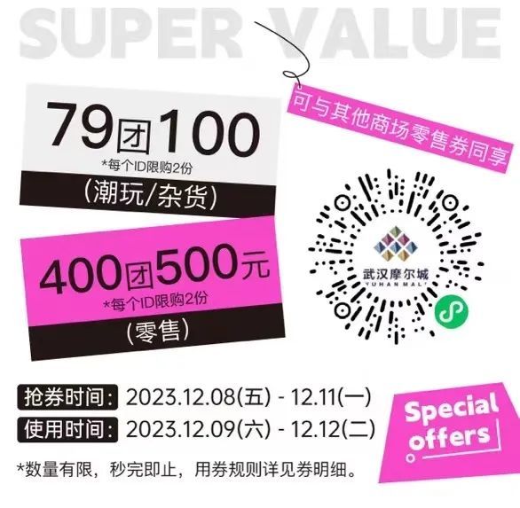 此外,12月8日—12月11日,每日10:00锁定武汉摩尔城微信公众号会员小程序,更多超值团券,持续放送!记得定好闹钟哦。