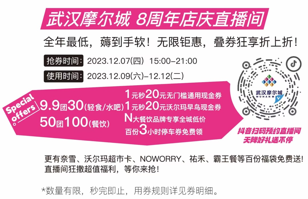 武汉摩尔城8周年庆放大招,抖音直播间12月7日15:00—21:00重磅上线,多款超值券限时开抢,1元秒20元无门槛通用现金券、1元秒20元沃尔玛现金券、9.9秒30元小食券、50团100元餐饮券,更有奈雪、沃尔玛超市购物卡、祐禾、NOWORRY、各类网红餐饮霸王餐等千份豪礼直播间0元送!让你期待值拉满,羊毛薅到手软。
