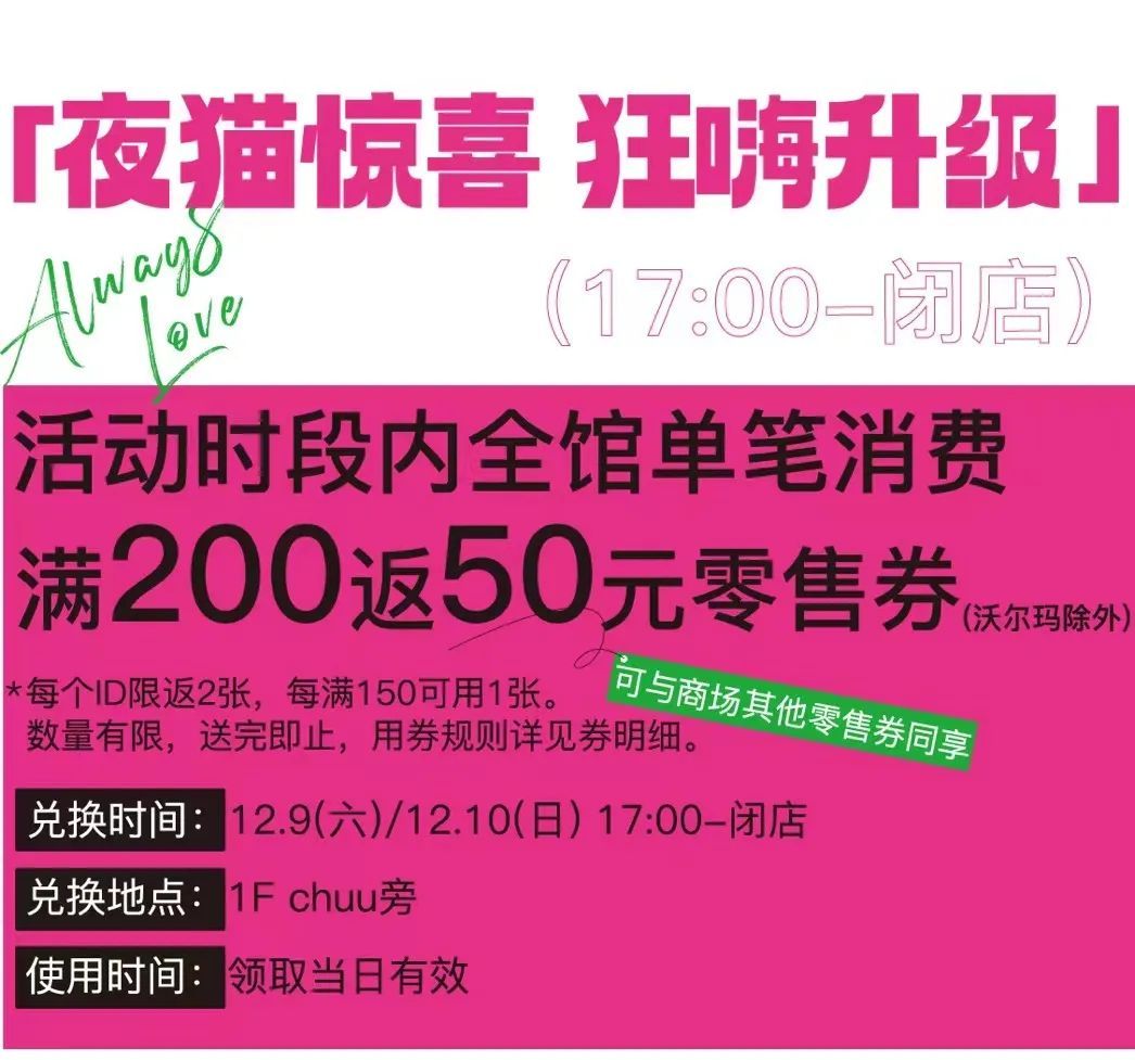 夜猫惊喜一:17:00—闭店时段消费就返券,全馆单笔消费满200元返50元零售券。