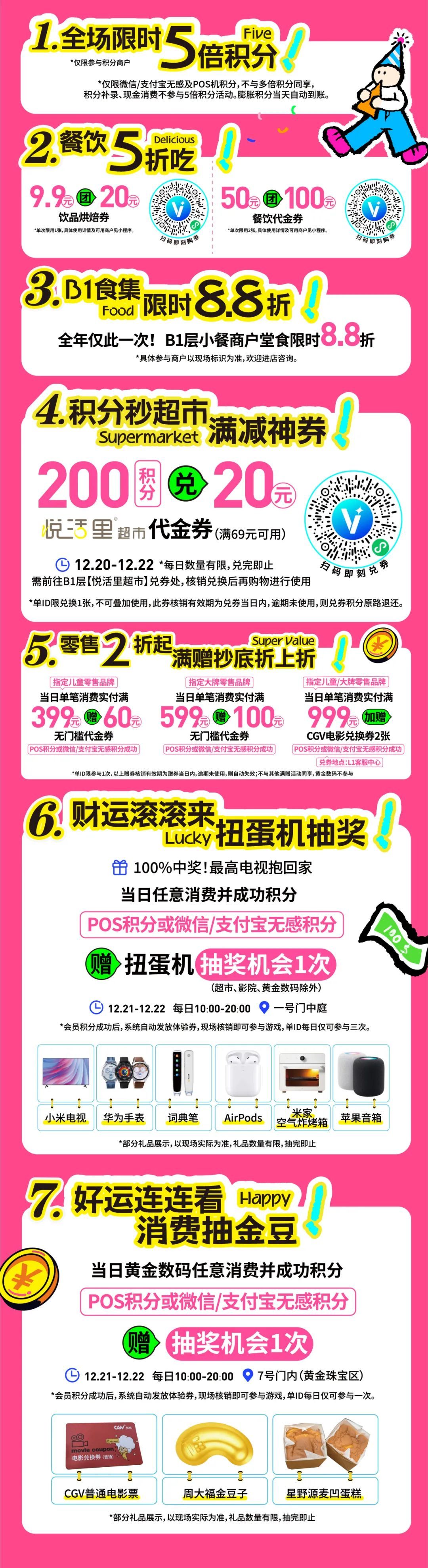 2周年生日庆典怎么少得了“薅羊毛”的快乐?5倍积分、餐饮5折吃、零售2折起满赠抄底折上折、超市满减神券、消费抽奖赢电视和金豆、12.21-12.22营业时间免费停车、滴滴半价出行等丰富福利回馈广大会员顾客。吃喝玩乐潮购,生日嘉年华一站式get。