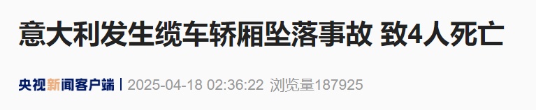 当地时间17日,在意大利南部坎帕尼亚大区那不勒斯省的法伊托山发生一起缆车轿厢坠落事故。当地救援人员表示,救援工作已结束,事故造成4人死亡、1人重伤。
