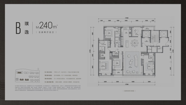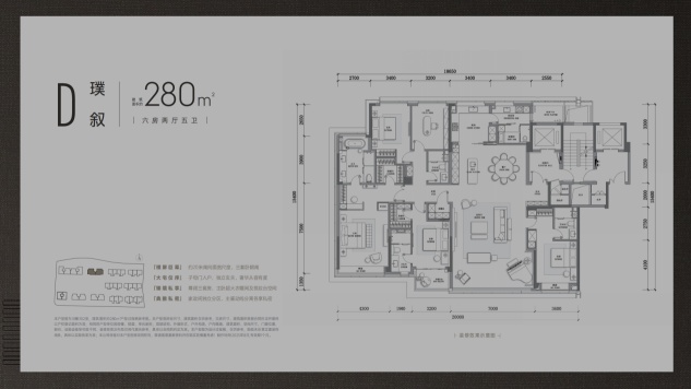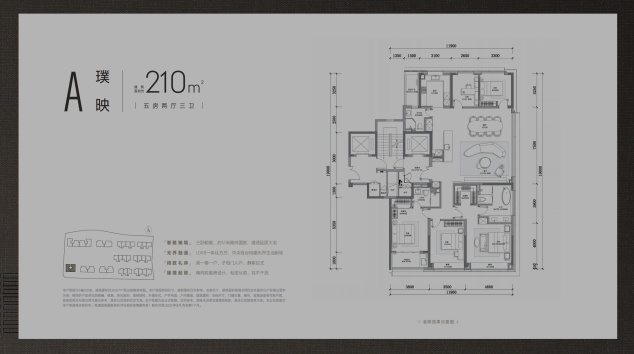 高层主力户型:约210㎡、240㎡、280㎡,全系五房标配