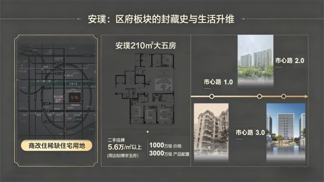 安璞所在的区府板块,是城市演进的“封藏史”。作为“商改住”释出的稀缺住宅用地,它从诞生起就注定只为少数人所有。更有意思的是安璞的成交画像。很多人就是从隔壁小区里的业主——像博学玉府这样的老牌大宅,目前二手挂牌依然能维持在5.6万/㎡以上。卖掉一套180方的四房,只需要再添上一两百万,甚至只是“平移”资产,就能入住安璞210㎡大五房,完成从“老破大”到“新顶豪”的跨越。