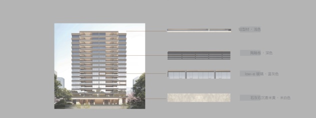 设计师以现代简洁的立面构图重塑传统意象,以蓝灰色通透玻璃与米黄色温润石材谱写主旋律,通过铝板、玻璃、石材的精妙组合,为现代建筑注入古典主义的端庄与温和。层间线条更精选专属烧制的金属釉面均瓷陶砖,构建出富有层次的艺术表达。