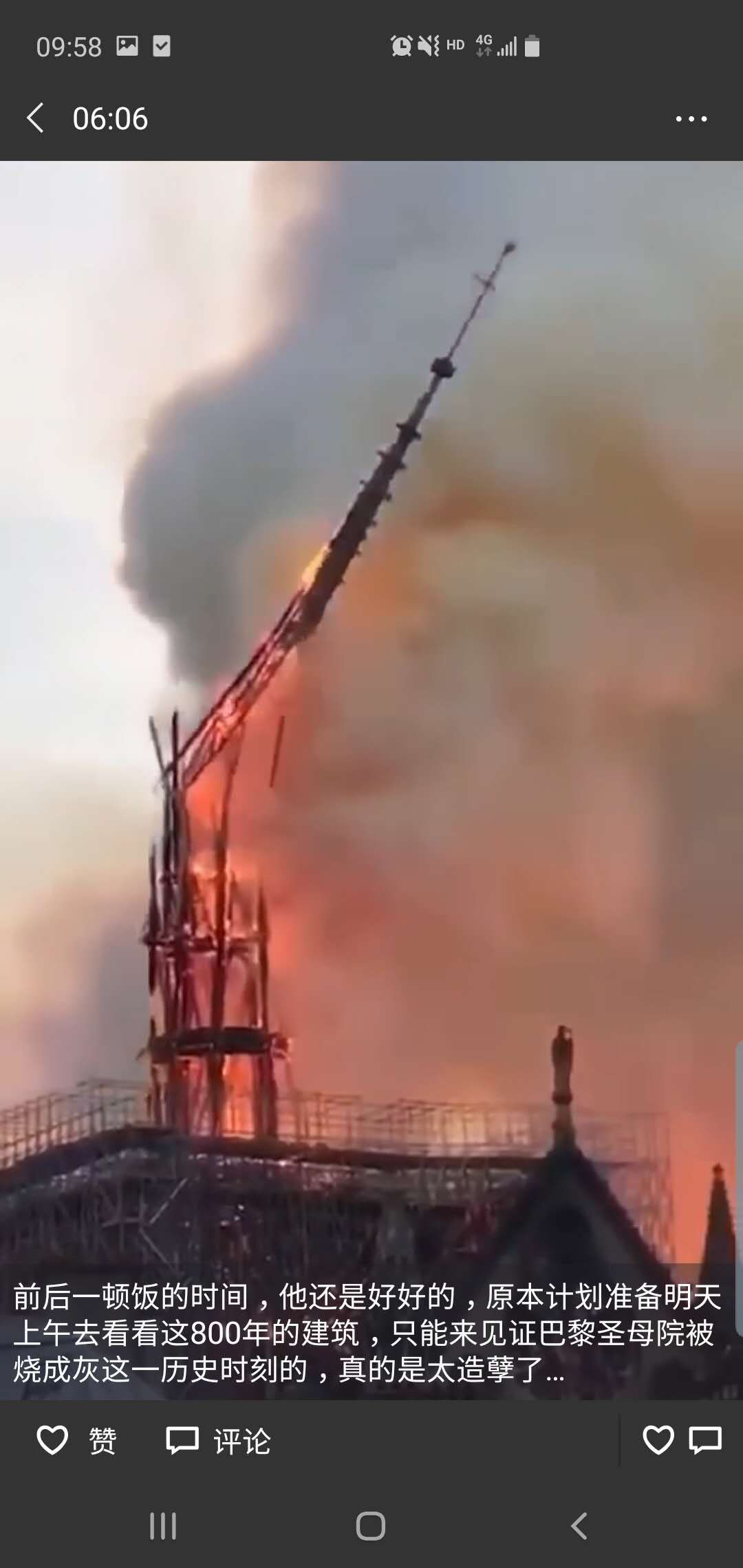“前后一顿饭的时间,他还是好好的,原本计划准备明天上午去看看这800年的建筑 ,只能来见证巴黎圣母院被烧成灰的这一历史时刻的,真是太造薛了……”