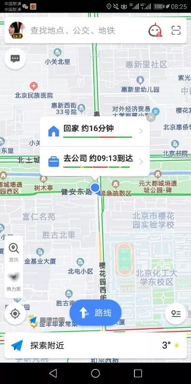 如果李先生习惯开车上下班,那么他进入通勤地图,获取的就是驾车用户的通勤方案,包括“用时时长”“路况信息”“路线规划”等。