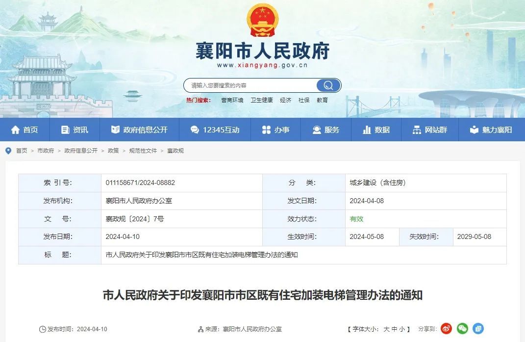 4月11日,记者从市政府办了解到,我市出台《襄阳市市区既有住宅加装电梯管理办法》,进一步完善既有住宅的使用功能,推进既有住宅加装电梯工作,提高宜居水平。