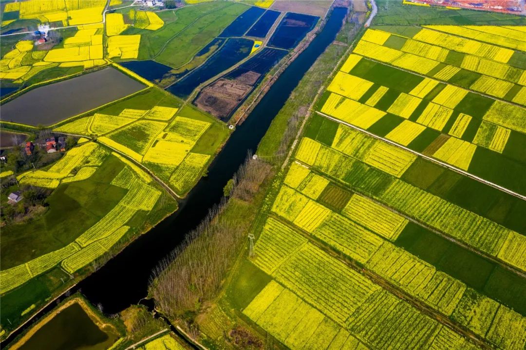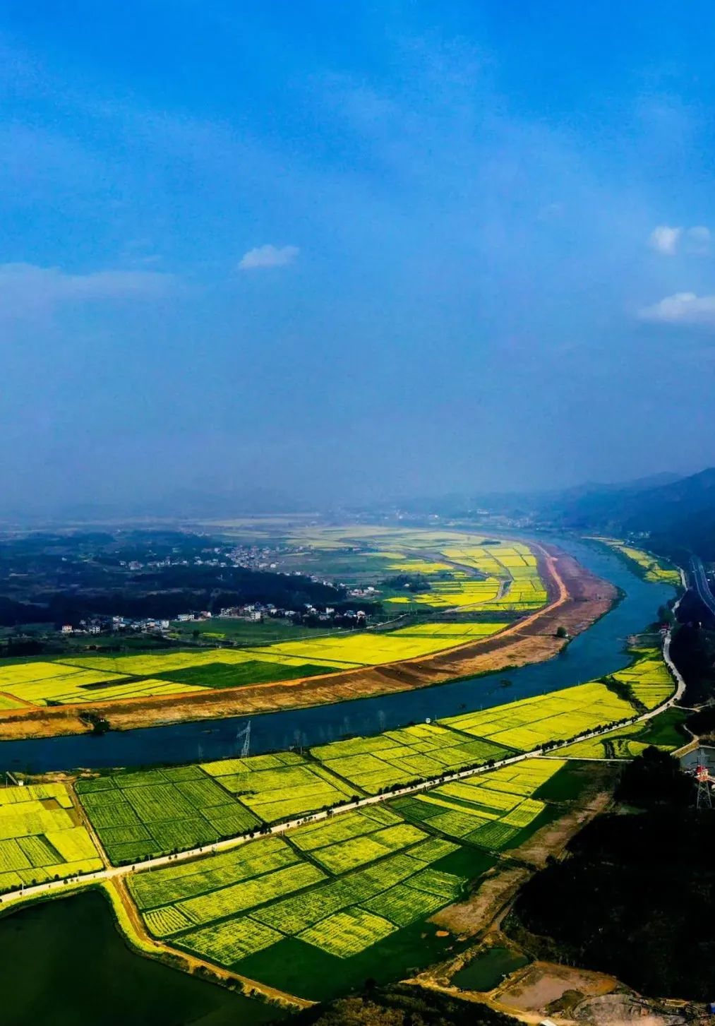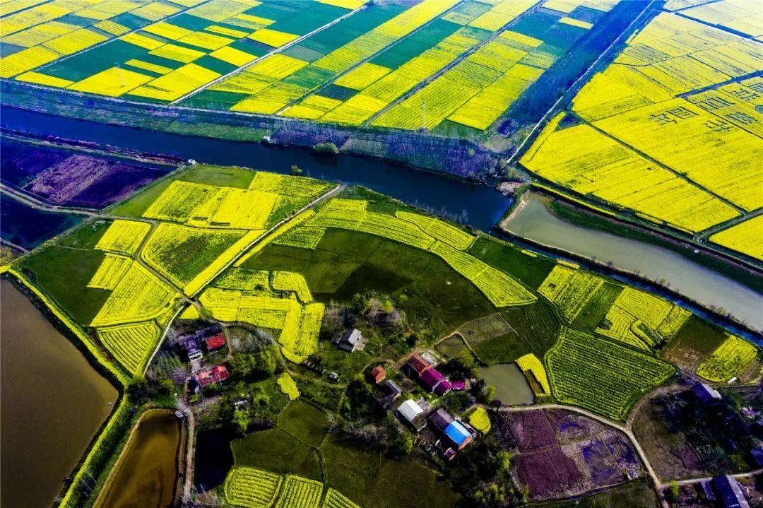 连片的油菜花海与富河交相辉映