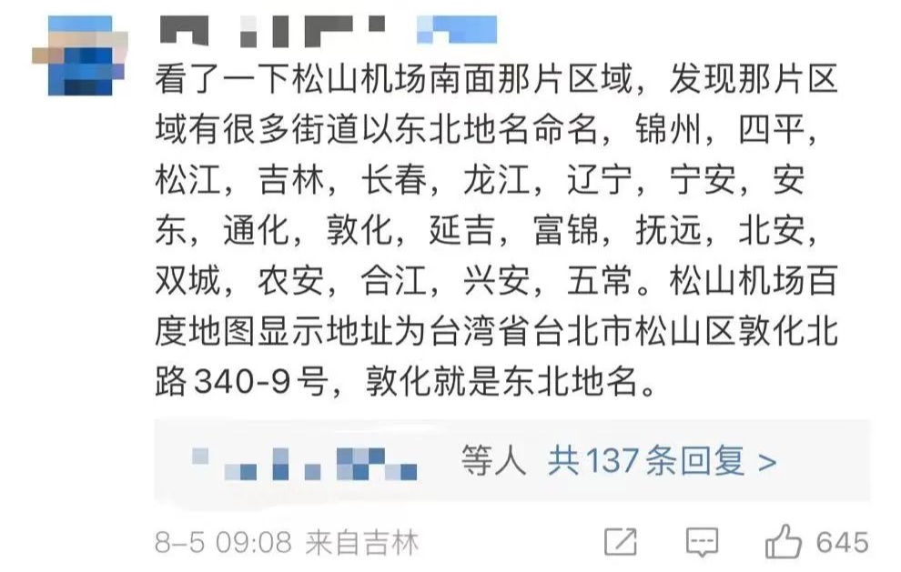还有网友说,松山机场附近,有很多以东北地名命名的街道。光是黑龙江省,台北相关的街道名,就有北安路、通北街、明水路、双城街、庆城街、富锦街、宝清街、抚远街、饶河街、五常街等。