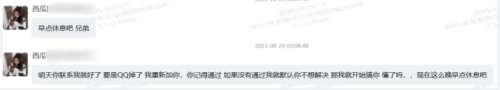 最后女网友还说:早点休息吧,兄弟。明天你联系我就好了……如果你不想解决,那我就开始搞你,懂了吗?现在这么晚了,早点休息吧。