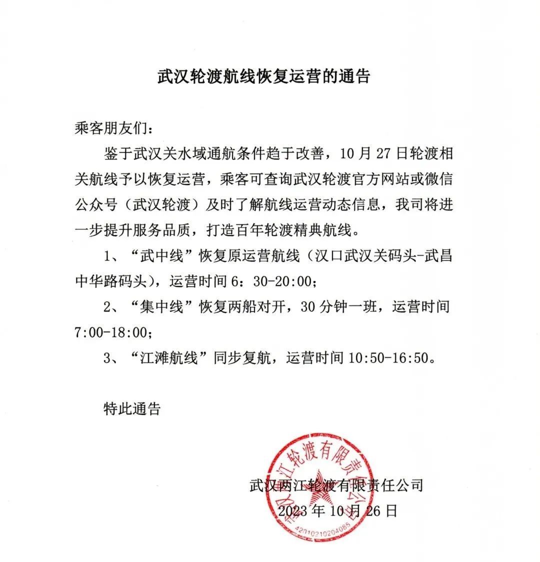 极目新闻记者从武汉两江轮渡有限责任公司获悉,鉴于武汉关水域通航条件趋于改善,10月27日轮渡相关航线予以恢复运营。具体如下: