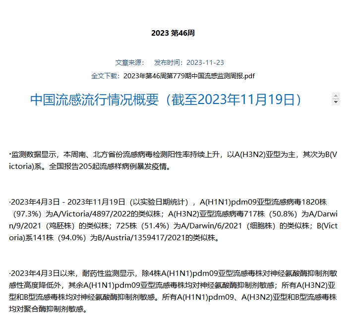 11月23日,中国国家流感中心网站发布2023年第46周流感监测周报。监测数据显示,2023年11月13日-2023年11月19日,南、北方省份流感病毒检测阳性率持续上升,以A(H3N2)亚型为主。全国报告205起流感样病例暴发疫情