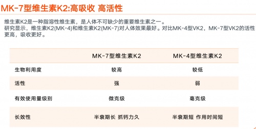 根据资料,MK-7型的维生素K2在生物利用度、活性、长效性等方面比行业其他产品使用的维生素K2(主要是MK-4型)表现更突出、更优异。