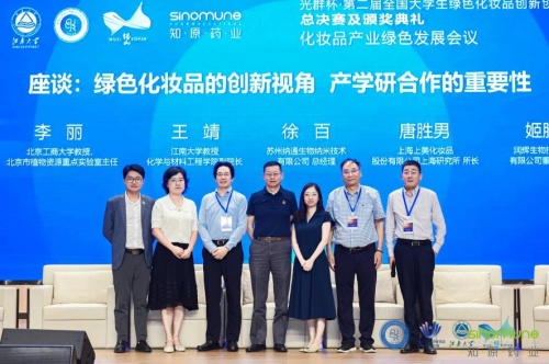 随后的圆桌论坛环节,在中国化妆品产学研协同创新平台秘书长、中国抗衰老促进会化妆品产业分会会长、第二届全国大学生绿色化妆品创新创意大赛执行委员会主任程伟的主持下,北京工商大学教授、北京市植物资源研究开发重点实验室主任李丽,江南大学教授、博士生导师李金华,苏州纳通生物纳米技术有限公司总经理徐百,上海上美化妆品股份有限公司上海研究所所长唐胜男,润辉生物技术(威海)有限公司董事长、总经理姬胜利,中国化妆品产学研协同创新平台常务副秘书长赵继华6位产学研代表就绿色化妆品的创新视角、产学研合作的重要性展开了热烈探讨。