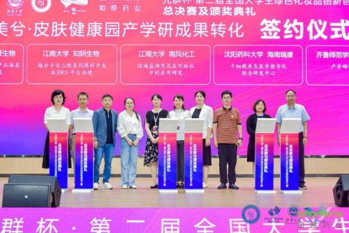 随后,NCGC赛事组委会副主任曹晓荣教授与合作单位江苏知原药业股份有限公司王晶总监、苏州纳通生物纳米技术有限公司徐百博士、山东半亩花田生物科技有限公司杨洁总监、阿茉尔(广州)生物科技有限公司殷传江董事长进行了赛事合作签约仪式。北京工商大学李丽教授与热景生物陈建国总监、江南大学杨井国主任与知妍生物王跃总监、江南大学李明副教授与南风化工研发中心陈海兰主任、沈阳药科大学李佐静教授与海南瑞康生物科技有限公司苏殿龙技术总监、齐鲁师范学院曹晓荣教授与润辉生物姬胜利总经理分别达成产学研成果转化签约,这些来自于本次大赛的优秀获奖作品后续将入美兮·皮肤健康园进行孵化。