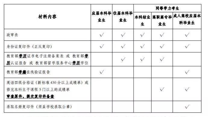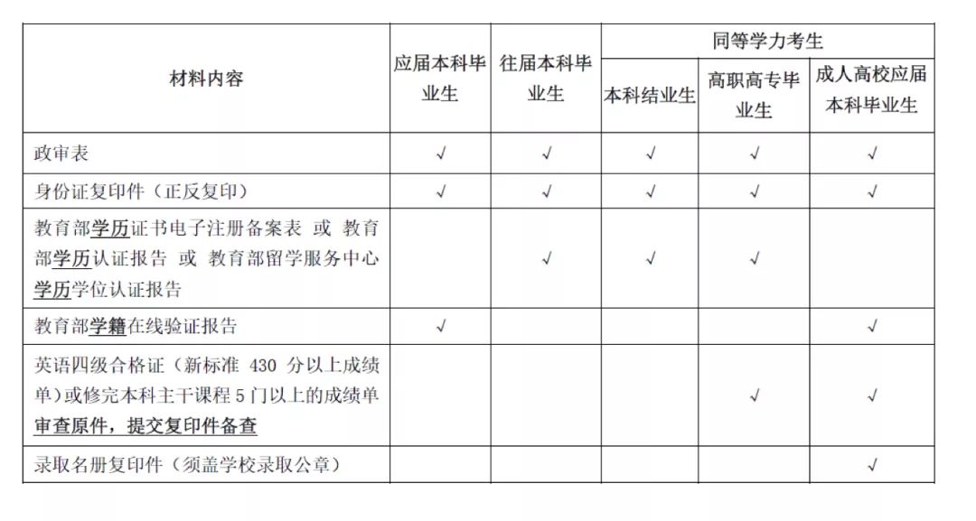 参加复试的考生携带本人身份证原件、毕业证书原件(往届)或学籍在线验证报告(应届)供资格审查。不同类别的考生还必须按照以下要求提交资格审查材料:
