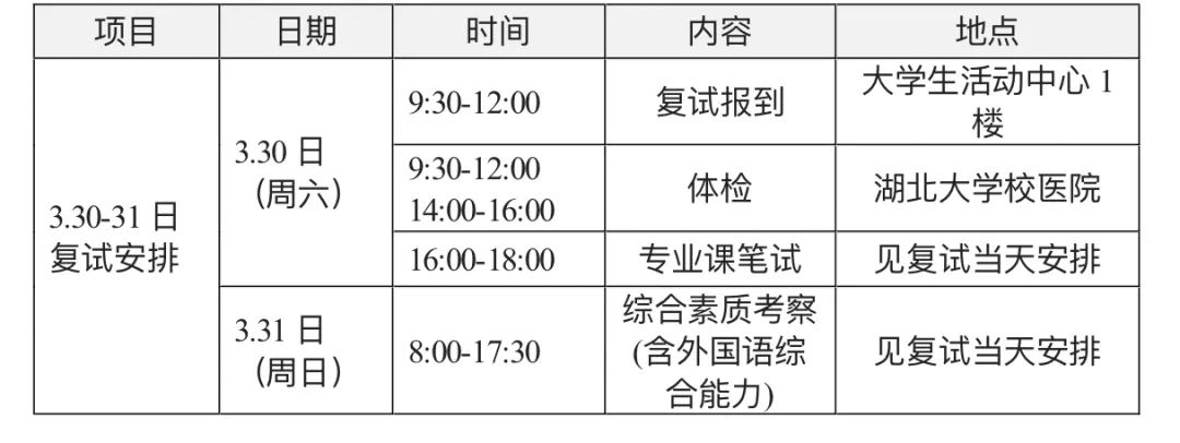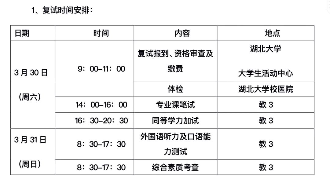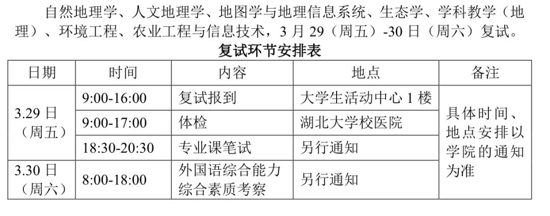 1.报到:定为3月29日(周五)到湖北大学大体育学院,办理报到及资格审查手续。逾期不报到者,将视为自动放弃复试资格。
