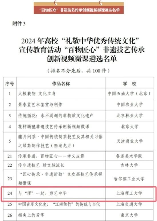 近日,教育部公布2024年高校“礼敬中华优秀传统文化”宣传教育活动结果,由上海理工大学党委宣传部、中英国际学院联合申报的《与“理”一起,剪艺中华》作品成功入选“百物匠心”非遗技艺传承创新视频微课。