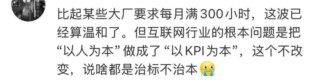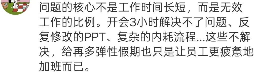 更有网友直言,弹性假期的出发点很好,但要能解决职场人的真正困境,减少无效工作时长才是核心,且企业管理不应一味追求KPI,而更要“以人为本”。