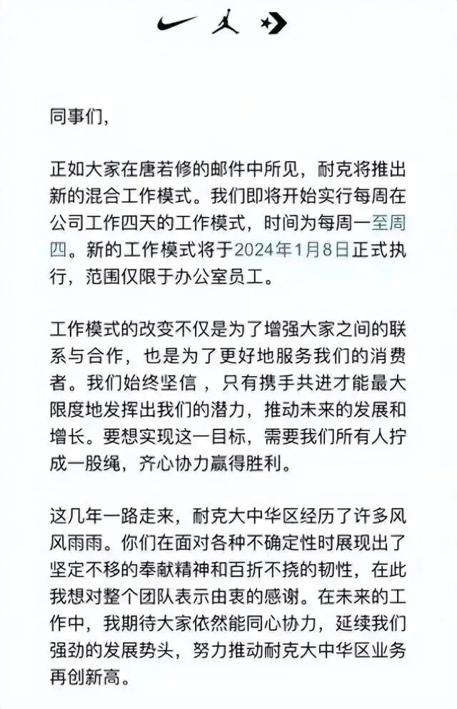 2023年10月,耐克大中华区在内部信中称,将推行“新的混合工作模式”,指周一至周四需在办公室办公,周五可选择居家办公,仅限办公室员工。