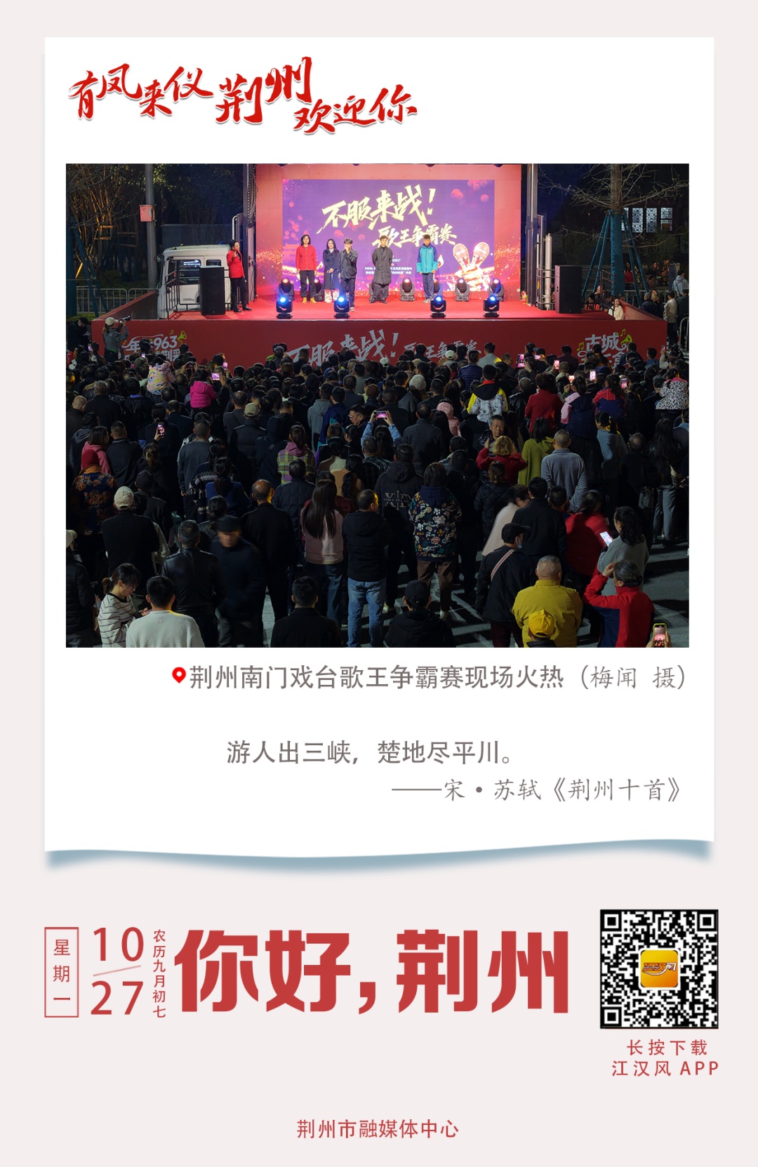 10月26日上午,本周第三场“全民K歌,南门戏台,不服来战”全民擂台歌王争霸赛,在荆州老南门广场继续激情开唱。24岁小伙黄树彬通过洪亮的嗓音和饱满的情感征服了现场评委与观众,一举拿下本场擂主。连续三日的音乐热潮在荆州古城南门汇聚,吸引了无数市民与游客驻足围观,现场气氛如火如荼。