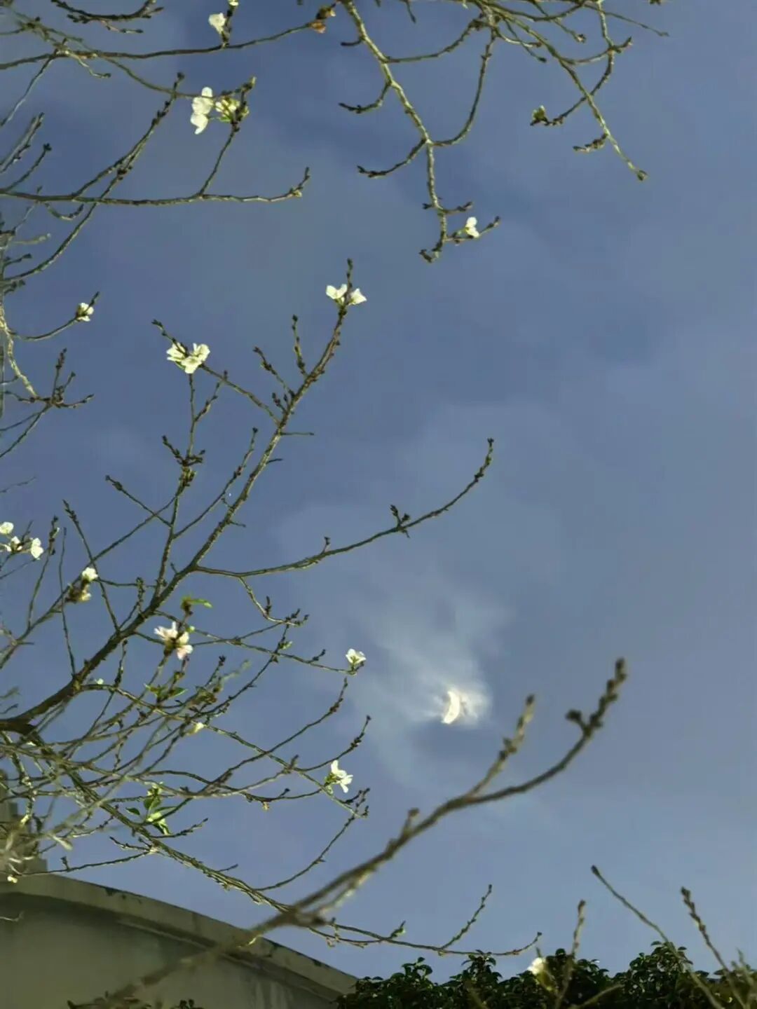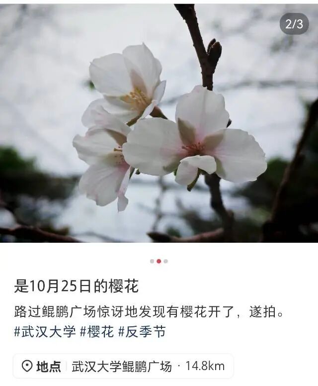 10月27日傍晚,秋月澄明,武汉大学鲲鹏广场,白色樱花与皎洁明月争辉。其实,武汉大学鲲鹏广场的樱花9月25日就已悄然绽放,不是春日那种繁花状态,而是三三两两签个到而已。